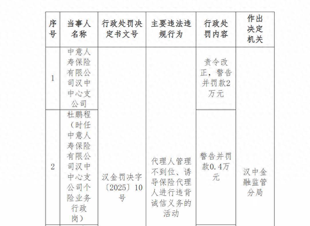 同时,杜鹏程(时任中意人寿汉中中心支公司个险业务行政岗)因代理人管理不到位、诱导保险代理人进行违背诚信义务的活动,被警告并罚款0.4万元;王垒(时任中意人寿汉中中心支公司银保中心主管)因代理人管理不到位、诱导保险代理人进行违背诚信义务的活动,被警告并罚款0.4万元。
