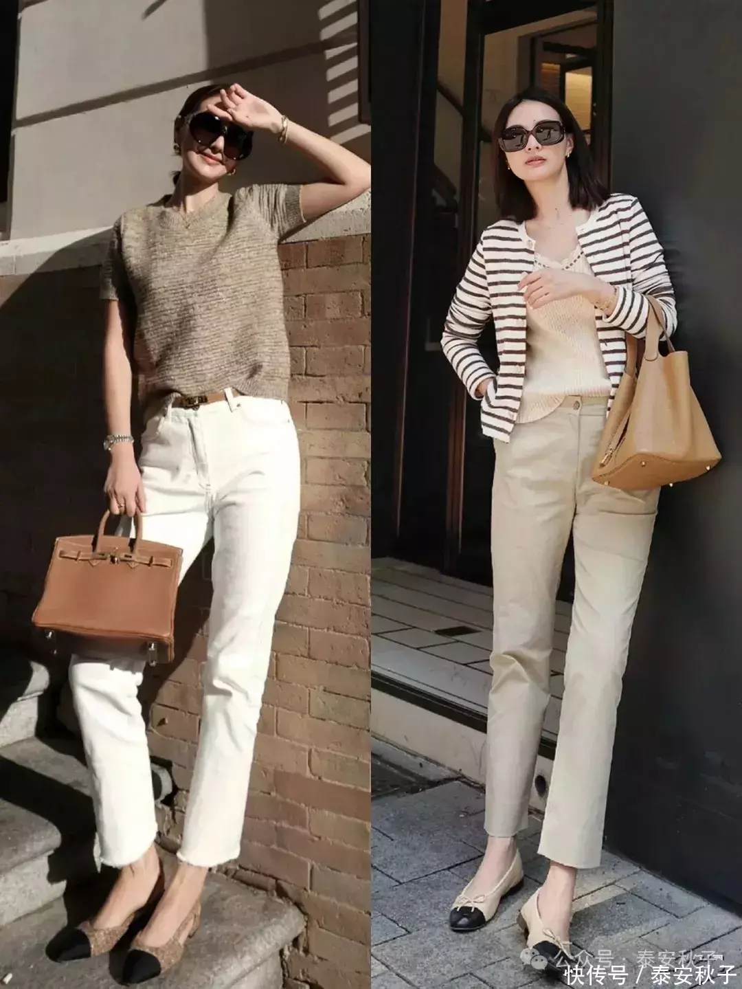 还有,这种彩色系的九分裤,选纯色、或带点设计感的小衫来配,就能轻松营造出休闲又时尚的氛围。中图的佐藤晴美便是用浅蓝色的九分牛仔裤,配了一件白色的刺绣小衫,经典又清新的配色,有着很好的显白效果。而后,她又用了浅驼色的鞋子与包包作为点缀,为整体造型增添一抹复古的韵味,让人眼前一亮。